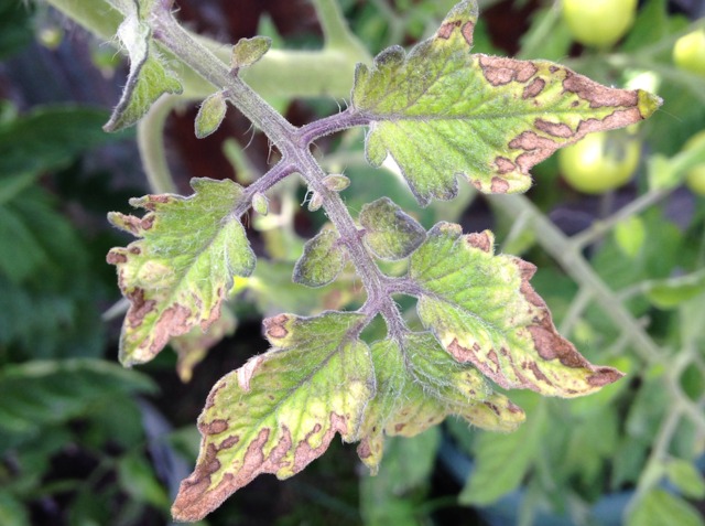 Carence en potassium sur plant de tomate (marge des feuilles brune et desséchée)