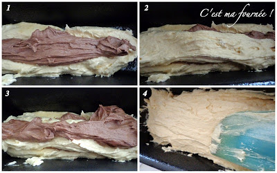 Dans le moule préalablement beurré ET FARINÉ, ou chemisé de papier sulfurisé, alternez les couches de pâte comme ci-dessous. Peu importe si l'appareil est épais et si cela vous semble moche, ça n'a aucune importance