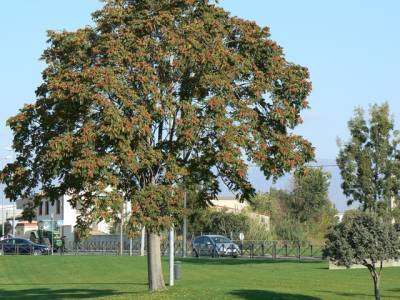 Les fruits en grappes de samares (4 cm) ressemblent à des bouquets de fleurs roses, en septembre.