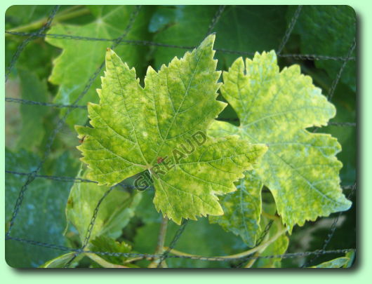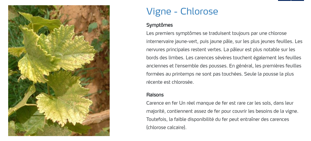 Le pic d’expression se situe au printemps, autour de la floraison On observe d’abord un jaunissement du limbe (couleur blanc nacré pour les symptômes sévères), les nervures restant nettement plus vertes Selon l’intensité de la chlorose, liée entre autres aux conditions de l’année, les dégâts évoluent vers un dessèchement du limbe entre les nervures (en commençant par le bord des feuilles), progressant de façon internervaire et pouvant aller jusqu’à la nécrose complète de la feuille (stade « Cottis ») Les jeunes feuilles sont touchées les premières, et les jeunes rameaux en croissance peuvent présenter des entre-nœuds raccourcis On remarque souvent une distribution par tâches dans les parcelles (zones plus humides, asphyxiantes, remontées de roche-mère calcaire, …)