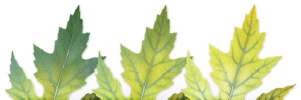 Chlorose vert-jaune, de l’intérieur vers l’extérieur chez les plus jeunes feuilles et les pousses. Les nervures gardent principalement leur couleur verte.