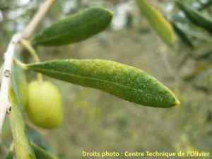 Les rares symptômes sur fruits correspondent à des taches plus ou moins circulaires de 3 à 7 mm de diamètre, dont la couleur varie selon la maturité : sur olives vertes, les lésions sont de couleur ocre à marron, alors qu’au cours de la véraison, les taches virent au gris / bleu, avec parfois un halo pâle ou jaunâtre.