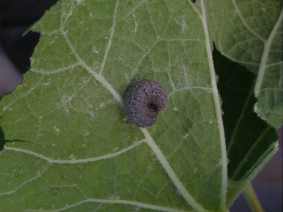 La chenille est de couleur beige, poilue, avec une tête noire et un collier jaune. Elle se constitue un abri dans une feuille de la plante hôte (Chez moi rose tremiere)