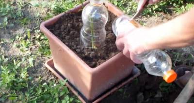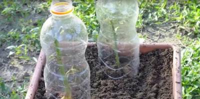 5) Coupez le fond des bouteilles de plastique et placez-les sur les tiges. Elles agiront en tant que mini serres et garderont les tiges bien au chaud.